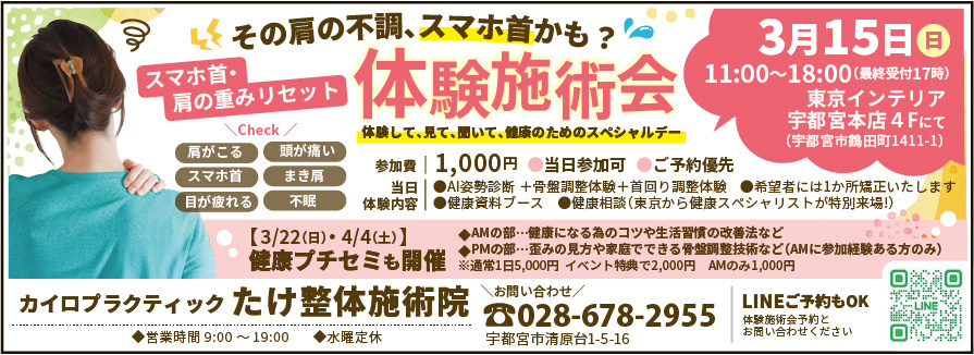 【宇都宮市】スマホ首・肩の重みリセット>体験施術会 ★ 3月15日(日)★ 開催!